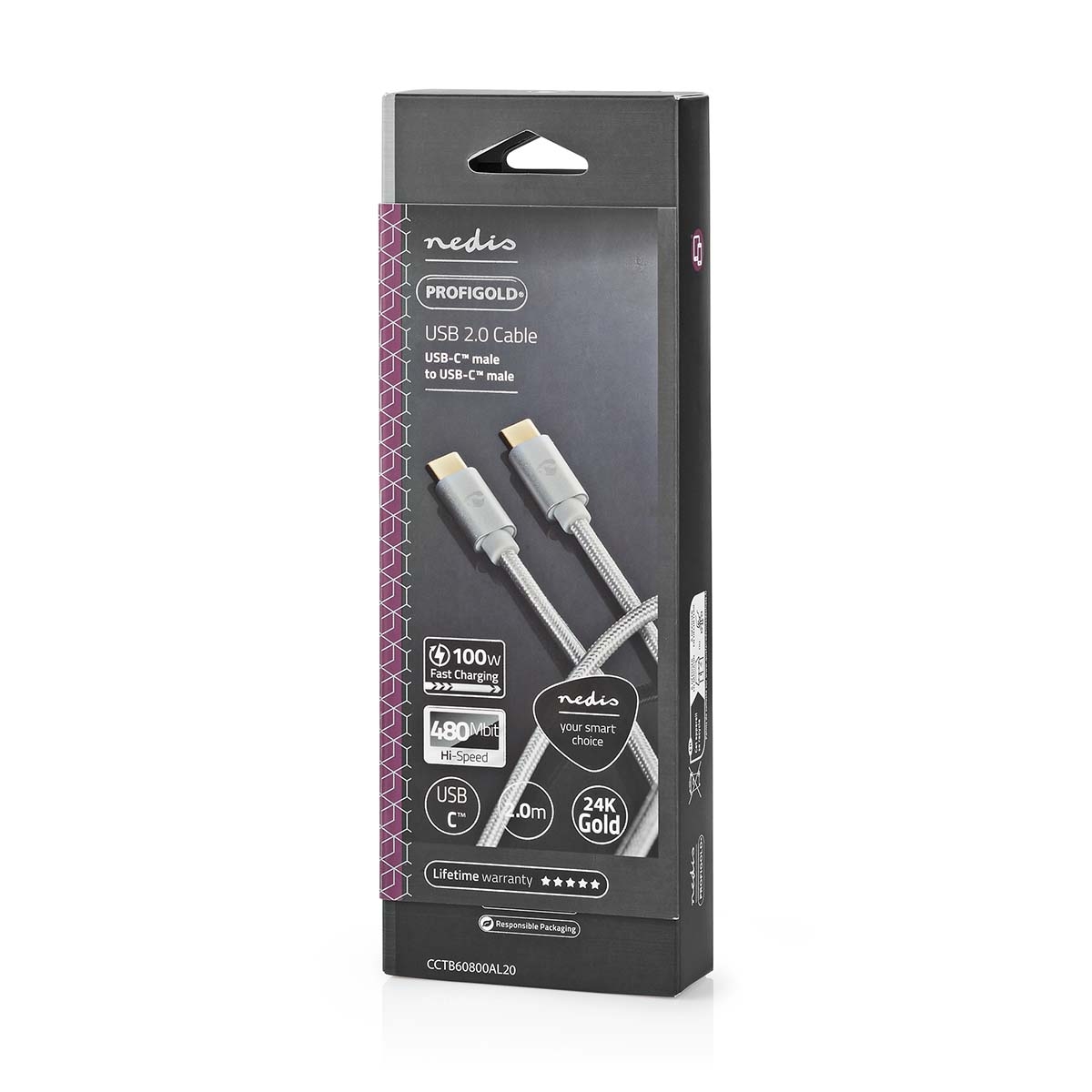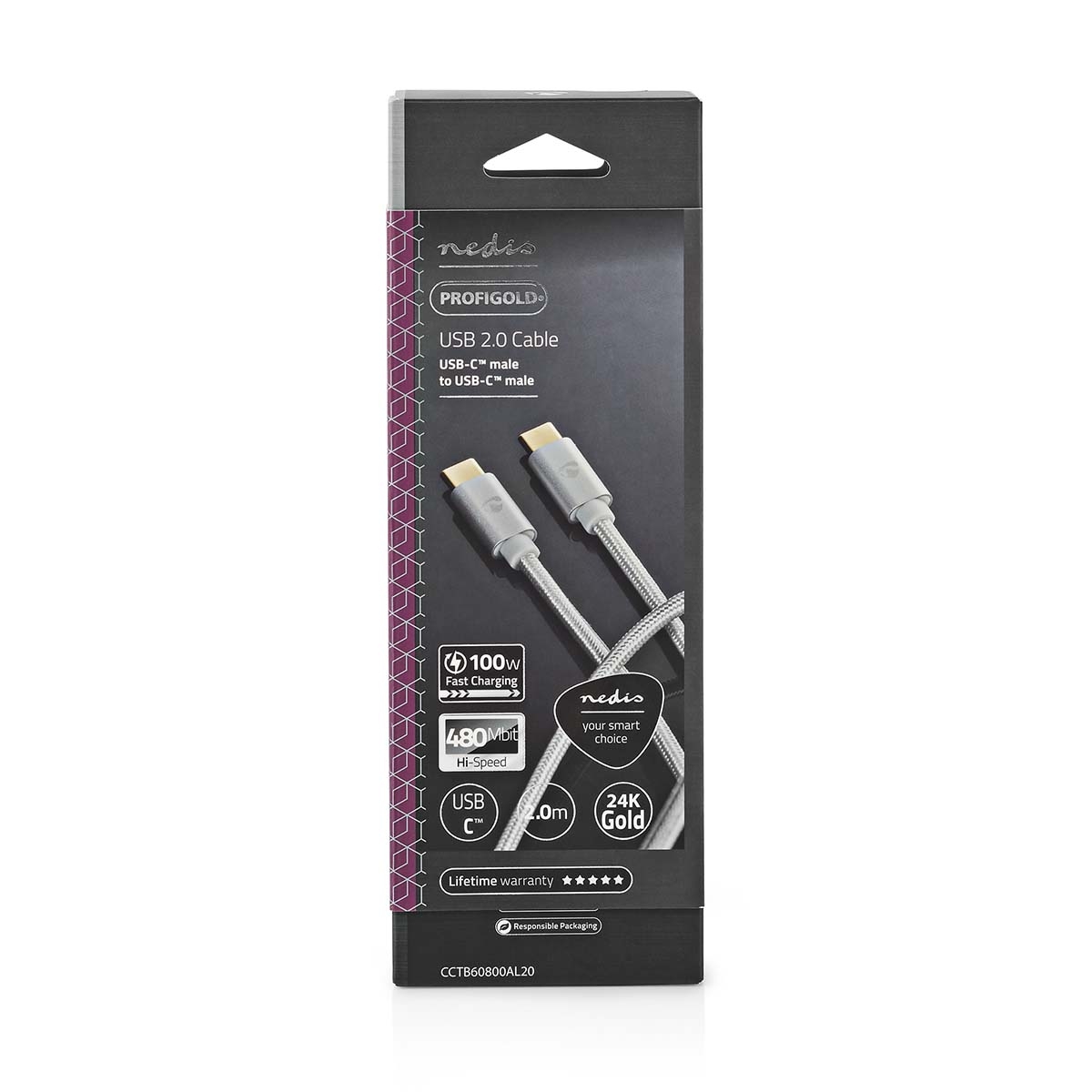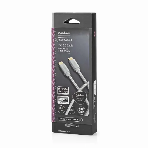 Nedis USB Cable | USB 2.0 | USB-C™ Male | USB-C™ Male | 100 W | 480 Mbps | Gold Plated | 2.00 m | Round | Braided / Nylon | Silver | Cover Window Box