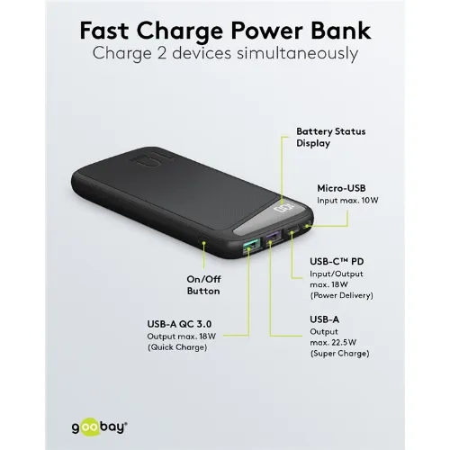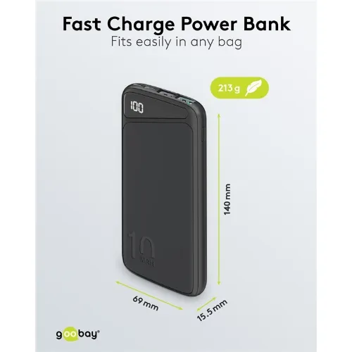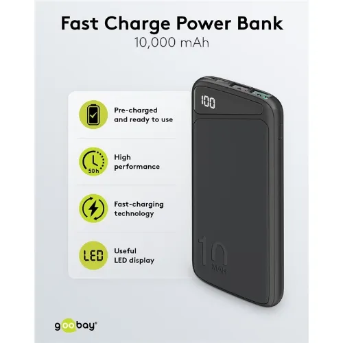 Goobay Fast Charge Power Bank 10,000 mAh (USB-C™ PD, QC 3.0) Powerful power bank with status display, Quick Charge compatible