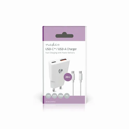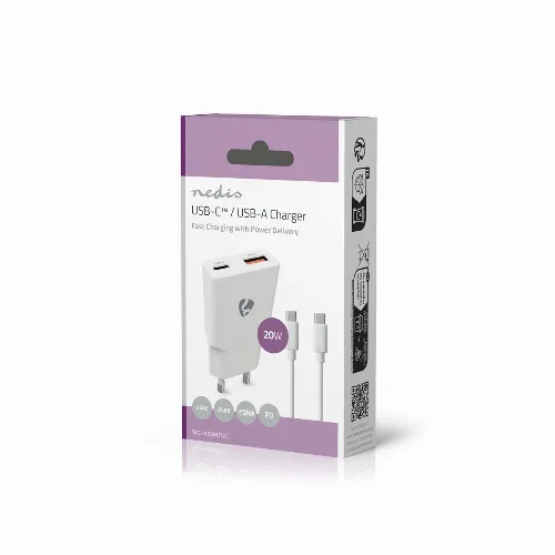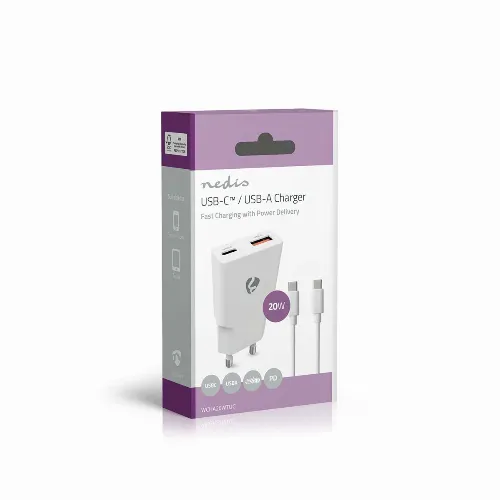 Nedis Wall Charger | PD3.0 | 1.5 / 2.0 / 2.22 / 3.0 A | Number of outputs: 2 | USB-A / USB-C™ | USB-C™ (Loose) Cable | 1.50 m | Automatic Voltage Selection | White