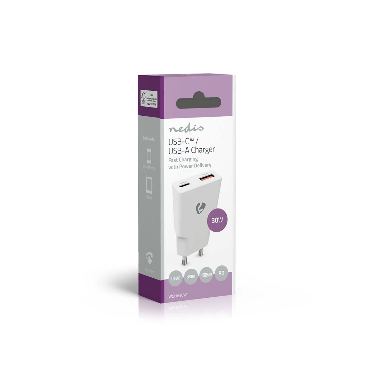 Nedis Wall Charger | PD3.0 | 1.5 / 2.0 / 2.5 / 3.0 A | Number of outputs: 2 | USB-A / USB-C™ | Automatic Voltage Selection | White